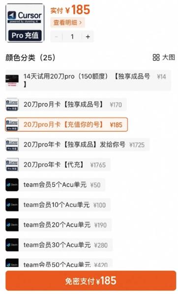 今晚本想给 Cursor 开个 20 美元/月的 Pro 会员。怕 Visa 外泄,上淘宝搜“Cursor 代付”,结果惊掉下巴:卖家一口价 180——185 元,比官网足足高出 36 元,月销几百单,年入小几十万妥妥的。