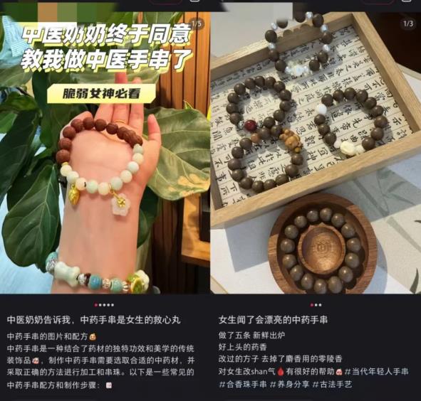 做法简单粗暴——把各类草本中药打成粉,捏成珠子,一串戴腕上,瞬间化身“行走的养生符”。失眠、焦虑、减肥……珠子对应什么功效,全看药材标签怎么写。中医、文玩、养生三大流量密码,一次性打包。