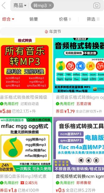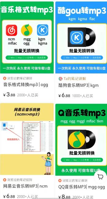 小红书同款商品:6.88 元一份“酷狗转 MP3 教程”,已卖 1 752 单,零技术含量,纯利润。