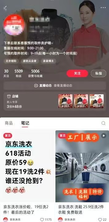 我上周刷小红书偶然刷到的号,目前 5k+ 粉,店铺主卖“京东洗衣鞋服务”: